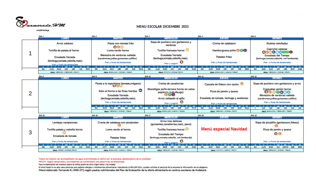 Recordamos que el menú cumple con las indicaciones de la Asociación Española de Pediatría y con el Reglamento (UE) 1169/2011 sobre información alimentaria. Para familias con estudiantes que presenten alergias o intolerancias alimentarias, toda la información sobre alérgenos está disponible en el etiquetado del producto y en las fichas técnicas que pueden solicitar a la dirección del centro.