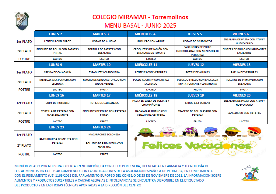 Recordamos que el menú cumple con las indicaciones de la Asociación Española de Pediatría y con el Reglamento (UE) 1169/2011 sobre información alimentaria. Para familias con estudiantes que presenten alergias o intolerancias alimentarias, toda la información sobre alérgenos está disponible en el etiquetado del producto y en las fichas técnicas que pueden solicitar a la dirección del centro.