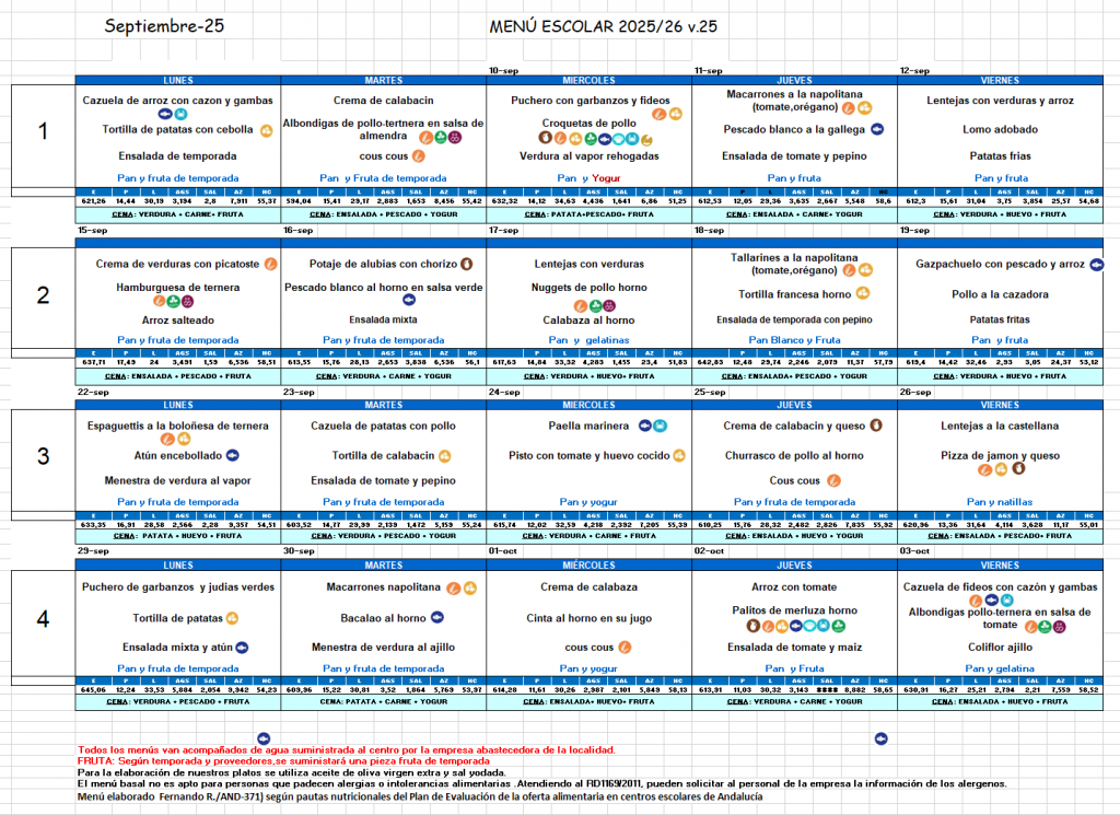 Recordamos que el menú cumple con las indicaciones de la Asociación Española de Pediatría y con el Reglamento (UE) 1169/2011 sobre información alimentaria. Para familias con estudiantes que presenten alergias o intolerancias alimentarias, toda la información sobre alérgenos está disponible en el etiquetado del producto y en las fichas técnicas que pueden solicitar a la dirección del centro.