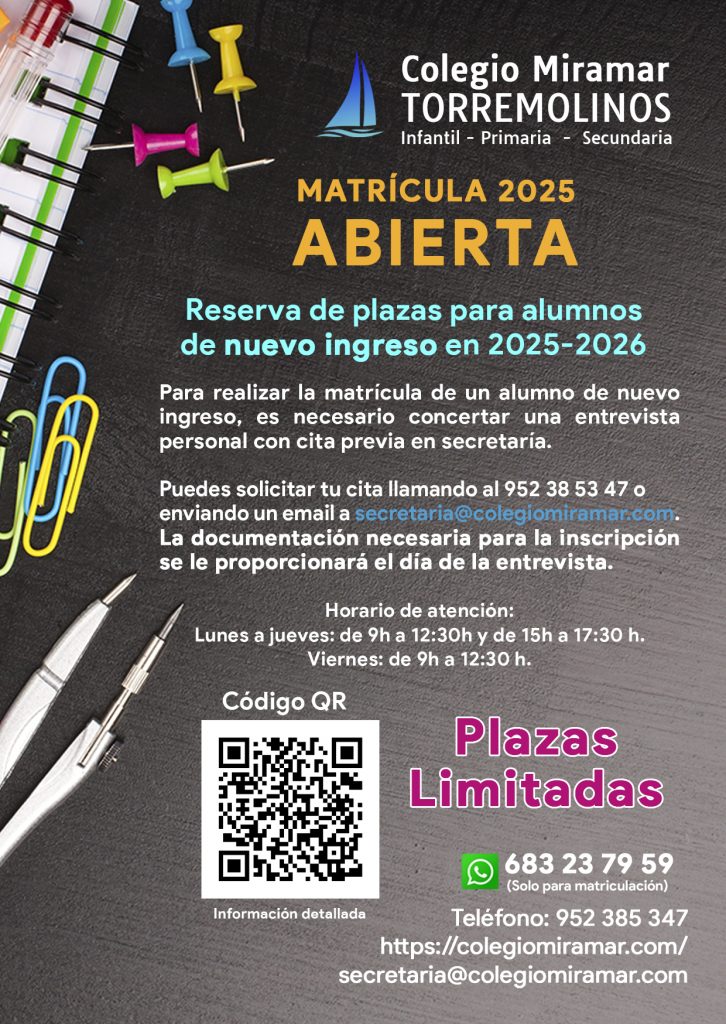 Para realizar la matrícula en el Colegio Miramar es necesario concertar una cita con secretaria, en el correo secretaria@colegiomiramar.com o por teléfono, llamando al 952 38 53 47.