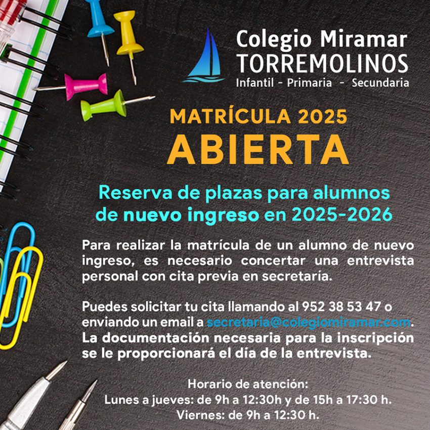 Para realizar la matrícula en el Colegio Miramar es necesario concertar una cita con secretaria, en el correo secretaria@colegiomiramar.com o por teléfono, llamando al 952 38 53 47.